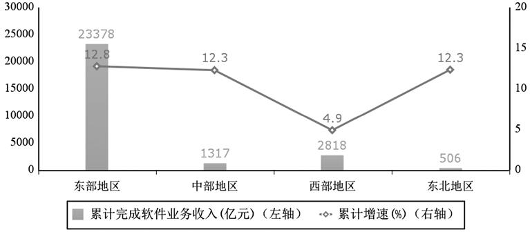 中部、东北地区软件业务收入增速加快。第一季度,东部地区完成软件业务收入为23378亿元,同比增长12.8%;中部地区完成软件业务收入为1317亿元,同比增长12.3%,增速较1—2月份提高15.7个百分点;西部地区完成软件业务收入为2818亿元,同比增长4.9%,增速较1—2月份回落0.3个百分点;东北地区完成软件业务收入为506亿元,同比增长12.3%,增速较1—2月份提高1个百分点。四个地区软件业务收入在全国总收入中的占比分别为83.4%、4.7%、10.1%和1.8%。