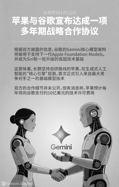 “经过仔细评估,苹果认定谷歌的AI技术能够为苹果基础模型(Apple Foundation Models)提供最强底层技术,我们很高兴它将为苹果用户带来创新的新体验。”双方在声明中如此表示。