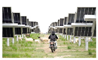 图为位于青海省的共和光伏产业园推广“光伏+生态”模式,将昔日荒滩变成牧场。 新华社记者 金良快 摄