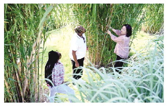 图为福建农林大学国际菌草工程技术研究中心副主任林冬梅(右)为来自卢旺达的留学生介绍菌草品种“绿洲一号”芦竹的生长情况。 新华社记者 林善传 摄