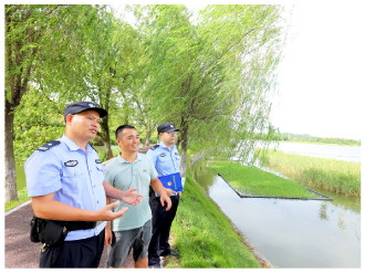 近年来,安徽省舒城县公安局在各景区配备“生态警长”,全力守护辖区生态环境。图为近日,舒城县公安局舒茶派出所民警在舒茶镇石塘村生态茶园开展巡查,并向游客讲解生态环境保护法律知识。 本报通讯员 王可海 摄