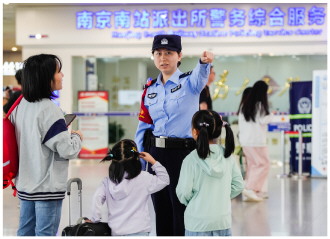 ▲ 近日,南京铁路公安处南京南站派出所持续推进“平安铁路—2025”“铁鹰”等专项行动,全力营造舒心、平安、畅通的出行环境。图为民警为旅客指路。