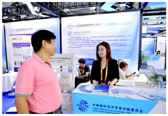 | 图为中国国际经济贸易仲裁委员会工作人员陈彦儒(右一)在2025年中国国际服务贸易交易会上为企业人员提供仲裁法律咨询服务。