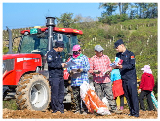 近日,吉林省通化边境管理支队太平边境派出所“田间警务”服务队走进田间地头,开展安全生产普法宣传。图为民警向村民发放宣传材料。 本报记者 张美欣 本报通讯员 郑博文 王植 摄
