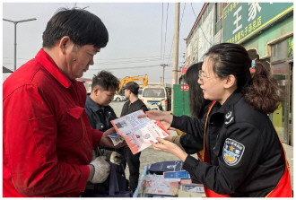 11月4日,新疆维吾尔自治区乌鲁木齐经开区(头屯河区)司法局王家沟司法所联合储运新村社区,在辖区开展普法宣传活动。图为司法所工作人员联合社区普法志愿者向居民讲解法律援助法等。 本报记者 潘从武 本报通讯员 张淑婷 摄