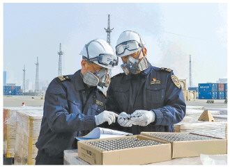 ▲ 近日,大连海关所属大窑湾海关查获一起非法入境固体废物案,海关依法对相关企业启动处罚程序,所查获的59.5吨废旧电池已在口岸监管机构全程监管下退运出境。图为大窑湾海关工作人员对旧电池进行查验。 本报记者 张国强 本报通讯员 崔晓东 肖雪 摄
