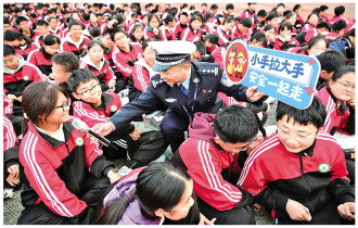 近日,安徽省固镇县公安局交管大队民警走进该县实验中学,为学生带来一堂生动的交通安全课。图为民警与学生进行互动问答。