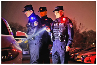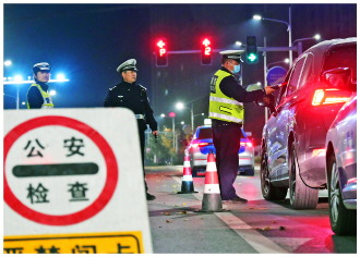 图① 11月16日,安徽省固镇县公安局交管大队民辅警在浍河路夜查交通违法行为。