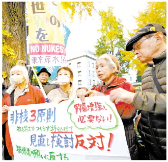 | 图为当地时间11月21日,日本原子弹氢弹爆炸受害者团体协议会等组织在日本国会前举行抗议活动,反对修改“无核三原则”和加强军备。 CFP供图