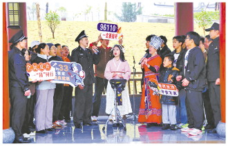 | 图为广西壮族自治区玉林市陆川县公安局民警近日来到文昌公园,与身穿民族服饰的歌手一同唱响禁毒、反诈主题山歌。 阮琬珍 摄 |