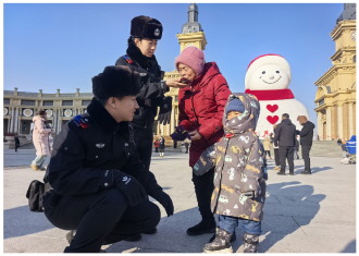 近日,黑龙江省哈尔滨市音乐广场19米高的巨型“网红大雪人”惊艳亮相,憨态可掬的造型引得八方游客纷至沓来。哈尔滨市公安局道里分局周密部署,全力保障冰雪盛会安全有序举行。图为民辅警帮助与家人走散的外地游客拨打电话。 本报记者 张冲 本报通讯员 王时 摄