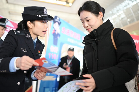 图② 1月9日,南京铁路公安处联合南京市公共交通和城市轨道公安局举办警营开放日活动,通过防盗防骗安全宣传、有奖知识竞猜、体验警用装备等环节,让旅客近距离体验警营生活。图为民警向旅客宣讲反诈知识。