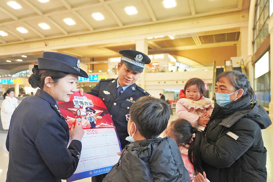 ① ② ③ 图① 2月2日为春运首日,安徽省砀山县公安局交管大队携手徐州铁路公安处砀山站派出所民警在火车站开展专题安全宣传。图为民警在高铁砀山南站向群众展示铁路旅客限制携带的物品。 本报通讯员 张广星 摄 图② 自春运开始以来,南昌铁路公安局福州公安处民警始终坚守岗位,做好铁路线路安全宣传。图为2月2日,福州铁路公安处泰宁站派出所民警深入沿线村庄,开展铁路安全宣传活动。 本报记者 王莹 本报通讯员 元博勋 摄 图③ 2月2日,武汉铁路公安处汉口站派出所组织民警在候车室开展“送新年挂历 讲反诈宣传”活动。图为汉口站派出所民警在候车室向乘客宣讲反诈知识。 本报记者 刘欢 本报通讯员 李鹏翔 摄