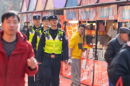 2月4日,为确保上海市崇明区城桥镇“新春年货节”活动安全有序,上海市公安局崇明分局城桥派出所采取“定点+动态”执勤模式,开展服务保障工作。图为民警在年货节现场执勤。
