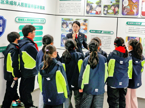 江苏省苏州市相城区人民检察院近日邀请小学生走进院内未成年人法治教育基地开展普法活动。图为干警通过以案说法方式向小学生讲解法律知识。 本报记者 罗莎莎 本报通讯员 黄丹 摄
