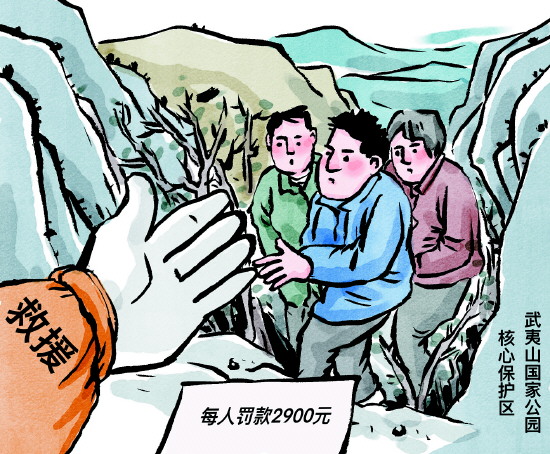 漫画/高岳 据媒体报道,近日江西3名“驴友”未携带任何登山装备进入武夷山国家公园未开发区域喝茶、拍雪景,返回途中被困山中。经过消防救援人员整夜搜寻,三人最终成功获救。依据相关规定,三人分别被处以罚款2900元的行政处罚。 点评:边赏山景边喝茶固然是美事一桩,但必须在法律允许的范围内。违规进入未开发区域,一旦遇险被困,将造成公共资源的巨大消耗。这2900元的处罚是教训,更是警示。 文/易木