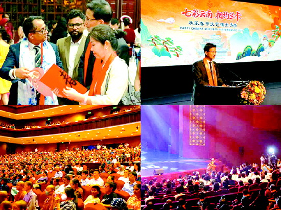左上图:中国驻斯里兰卡大使戚振宏、参赞吉莉莉向斯里兰卡议长维克勒梅拉特纳介绍中国的春节文化;右上图:戚振宏大使致辞;左下图:能容纳1200人的剧院座无虚席;右下图:云南省大理白族自治州白剧团《变脸》节目演员现场与观众互动,受到观众追捧。