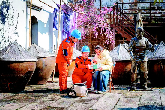 ▲ 近日,国网衢州供电公司组织员工走进浙江省江山市清湖公泰酱园,开展电力普法宣传活动。图为供电公司员工向返乡大学生讲解安全用电和电力设施保护知识。