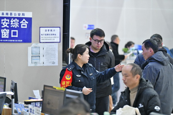 ▲ 春节将至,安徽省阜南县公安局车辆和驾驶人管理所迎来办理车驾管业务高峰,该所为提升办事效率,根据实际业务量设置潮汐窗口和学雷锋示范窗口。图为2月9日,工作人员为群众办理车驾管业务。 本报通讯员 吕乃明 摄