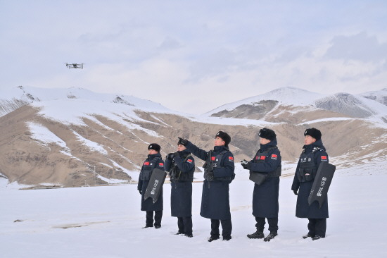 图为红其拉甫边境派出所民警在边境线上操作无人机开展空中巡逻。 赵家充 摄