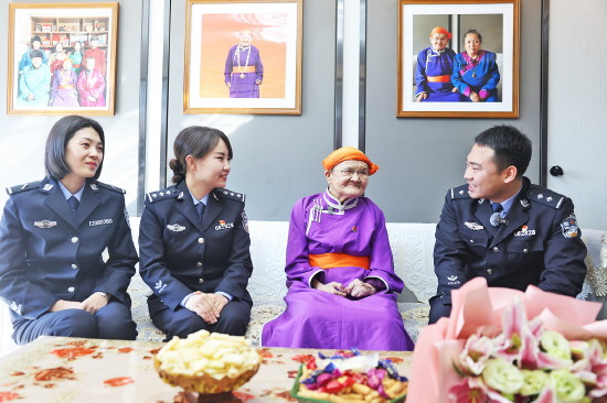 图为锡林郭勒盟公安局民辅警走访都贵玛老人。