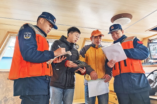 不远处的另一艘渔船上,执法员正蹲在船舱底部检查消防器材,还不忘叮嘱船老大,遇到突发恶劣天气应该如何避险自救。