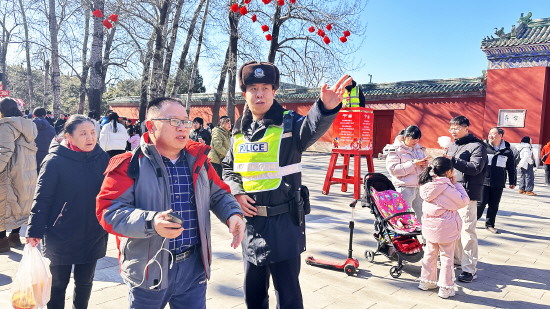 8点30分,随着舞狮表演开始,第三十八届地坛春节文化庙会正式开幕。朱门缓启,人流向前涌动,与热闹喜庆的人群相伴而行的,还有一抹抹藏蓝身影,维护秩序、贴心服务,用行动织密安全防线,让年味更浓、平安更实。