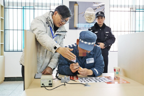 图为蛋雕非遗代表性传承人于洁林指导罪犯雕刻。