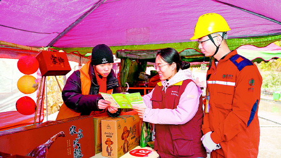 近日,国网衢州供电公司员工走进浙江省衢州市开化县齐溪镇某商铺,开展电力法规宣传活动。图为供电公司员工向商户讲解安全用电知识。 陈晓锋 摄