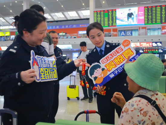 连日来,广西各地迎来春运返程高峰,南宁铁路公安局柳州公安处组建反诈小分队走进柳州站候车室,通过宣讲反诈知识、展示反诈标语、以案释法等方式,向旅客普及防范电信网络诈骗知识。图为民警对旅客开展反诈安全提醒。 本报记者 吴良艺 本报通讯员 杨思彤 彭佳静 摄