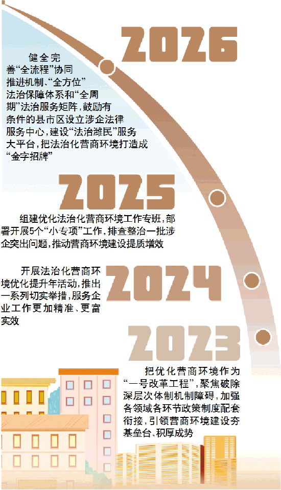 2025年,组建优化法治化营商环境工作专班,部署开展5个“小专项”工作,排查整治一批涉企突出问题,推动营商环境建设提质增效。