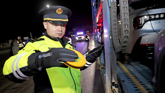 近日,安徽省合肥市交通运输综合行政执法支队联合相关部门在境内高速服务区开展轿运车违法查处“利剑行动”,全力保障春运期间道路安全畅通。图为执法人员对车辆装载数量、外廓尺寸、安全设施配备等情况进行核查。本报通讯员 汪宜胜 摄