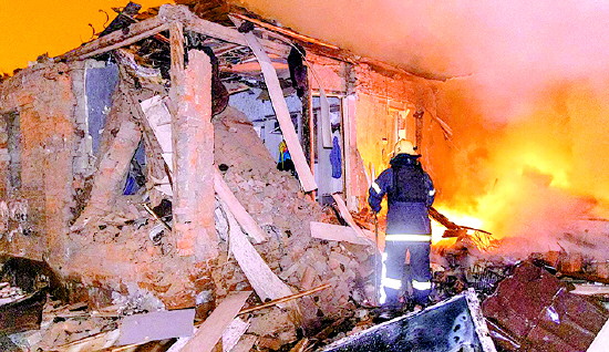 图为当地时间2026年2月26日,乌克兰哈尔科夫,一名消防员正在扑灭俄罗斯袭击后受损房屋的火灾。 CFP供图