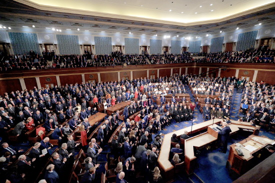 图为当地时间2026年2月24日,美国总统特朗普在国会联席会议上发表国情咨文。