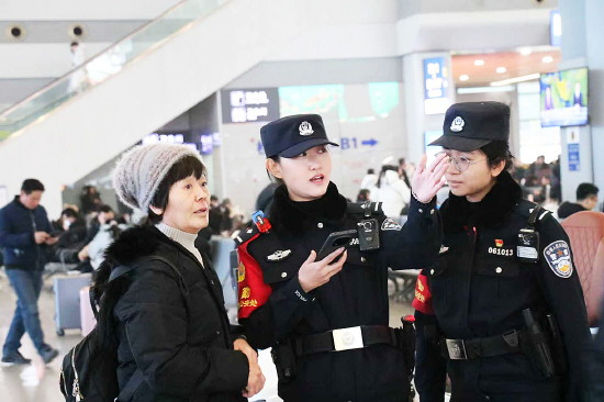 春运以来,太原铁路公安处太原南站派出所与车站客运部门联动配合,实时掌握客流动态,科学部署警力,持续优化服务与安保措施。图为民警向旅客提供咨询服务。