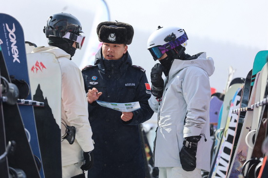 近日,新疆出入境边防检查总站阿勒泰边境管理支队吐尔洪边境派出所民警走进可可托海国际滑雪场,全力护航辖区旅游平稳有序。图为民警在雪场对游客进行安全提醒。 本报记者 潘从武 本报通讯员 石晓坤 摄