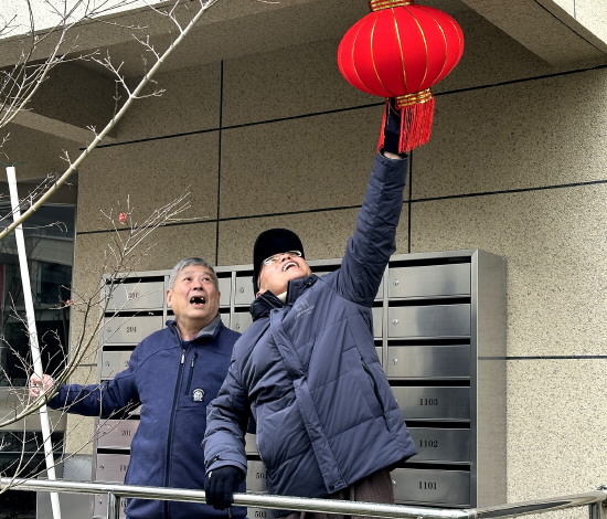 图为上海市静安区彭浦新村街道彭一小区回迁居民悬挂红灯笼喜迎新春。