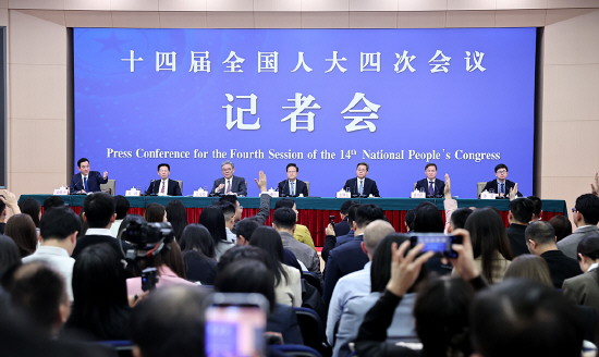 3月6日,十四届全国人大四次会议在北京梅地亚中心新闻发布厅举行经济主题记者会,国家发展和改革委员会主任郑栅洁、财政部部长蓝佛安、商务部部长王文涛、中国人民银行行长潘功胜、中国证券监督管理委员会主席吴清就发展改革、财政预算、商务、金融证券等相关问题回答记者提问。 本报记者 徐伟伦 摄