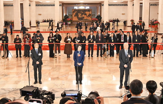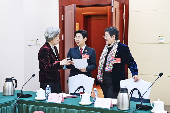 ① ② 图① 3月7日,全国政协十四届四次会议第二场“委员通道”集体采访活动在北京人民大会堂举行。 图② 3月6日,全国政协十四届四次会议举行小组会议,全国政协委员、陕西省人民检察院副检察长高洁(中)会后与其他委员交流。 本报记者 范瑞恒 摄