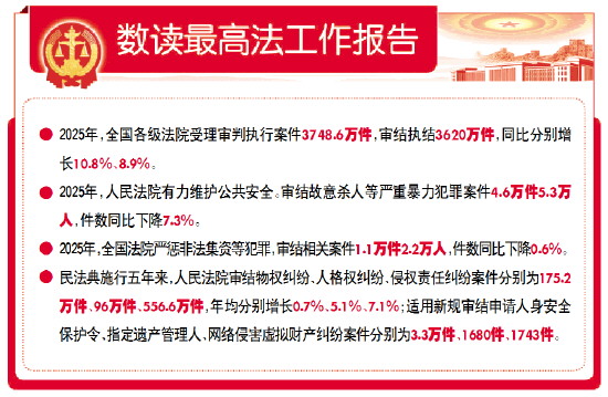 报告着重强调“恪守公平正义”,围绕“保障高水平安全”“服务高质量发展”“守护高品质生活”“助力高水平开放”等方面,回顾了2025年人民法院各项工作。