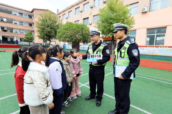 近日,江西省分宜县公安局交管大队组织民辅警深入辖区学校,开展“文明交通 平安出行”主题普法宣传活动,通过案例讲解、互动问答等方式,引导学生自觉遵守道路交通安全法律法规,养成文明出行良好习惯。图为民警在分宜县凤阳中心学校向学生宣讲交通安全知识。 本报记者 黄辉 本报通讯员 黄小军 摄