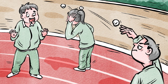 小亮为了不被小明抓到,经常掉转方向,还时不时地回过头冲着小明吐舌头,存心气他:“你不是跑步冠军吗?”