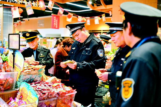 3月13日,安徽省阜南县公安局联合市场监督管理局、农业农村局等部门开展“3·15”消费者权益保护专项执法检查,维护消费者合法权益。图为民辅警和市场监督执法人员在商场检查食品安全情况。 本报通讯员 吕乃明 摄