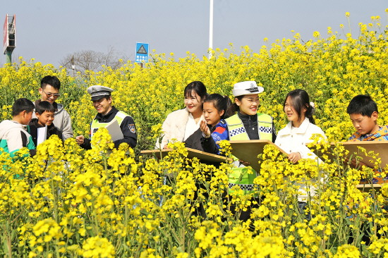 近日,安徽省舒城县公安局交管大队联合舒茶派出所组织民辅警来到舒茶镇龙王庙村油菜花田开展交通安全宣传活动。图为活动现场。 本报通讯员 王可海 摄