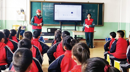 近日,国网奎屯供电公司组织青春光明行志愿者服务队,走进新疆维吾尔自治区伊犁哈萨克自治州奎屯市第三小学,开展安全用电宣传活动。图为服务队队员向同学们讲解安全用电知识。 王婷 摄