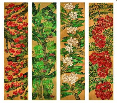 岭南风情——木棉、芭蕉、蛋花、荔枝(中国画)林蓝
