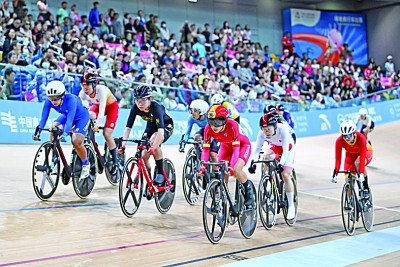 11月16日,十五运会场地自行车女子麦迪逊赛决赛在香港举行。图为参赛选手在比赛中。新华社发
