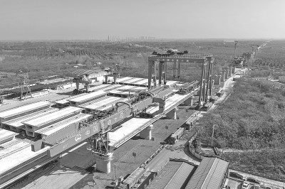 ??近日,合武高铁安徽段全面进入箱梁架设阶段,施工人员奋战在架梁一线,确保重点铁路工程建设进展顺利。图为11月15日,合武高铁安徽段站前一标肥西制梁场首榀箱梁架设现场。 新华社发