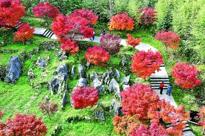 ??初冬时节,神州大地美景如画。图为11月16日,游客在湖北省宣恩县锣圈岩地质公园的枫林间漫步游玩。
