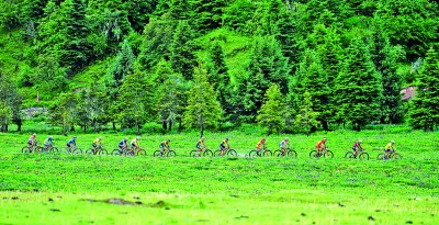 西藏林芝,2025年中国山地自行车联赛第四站的参赛选手穿过山野,享受骑行乐趣。新华社发
